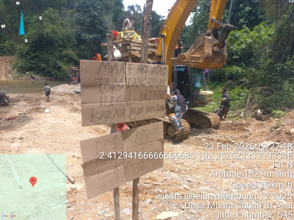 Sarolangun – Puluhan warga Dusun Muara Cuban, Kecamatan Batang Asai, Kabupaten Sarolangun, Jambi, memblokade akses menuju lokasi aktivitas Penambangan Emas Tanpa Izin (PETI), Senin (23/2). Aksi tersebut dipicu tuntutan penghentian total kegiatan tambang ilegal yang dinilai merusak infrastruktur desa dan mengganggu kehidupan sosial masyarakat.